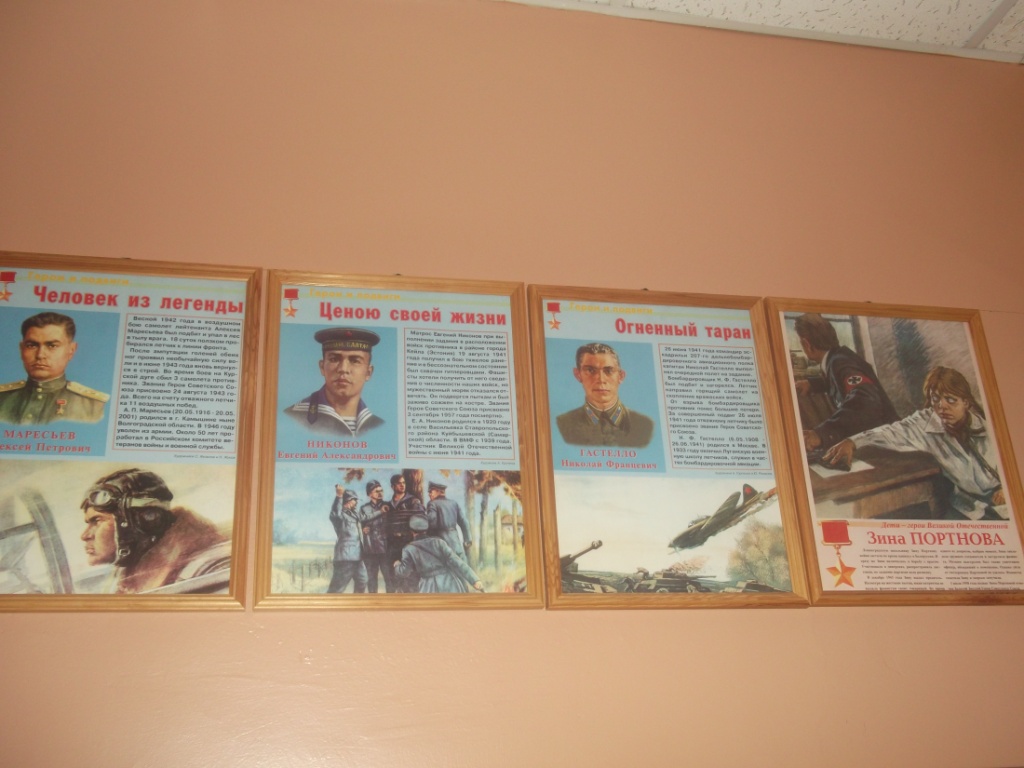 На основных стендах и витринах музея отражены наиболее крупные сражения Великой Отечественной войны. Там расположились фотографии и краткое описание рассматриваемых событий. На дополнительных стендах представлены выставки рисунков и стенгазет, сделанные учениками школы. Одними из самых ценных экспонатов музея является коллекция предметов, найденных учениками школы на полях сражений.