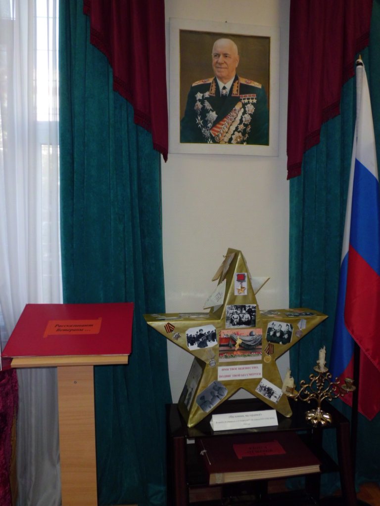 Память о ветеранах Великой Отечественной войны – жителях микрорайона увековечена в витринах, где собраны материалы из семейных архивов. В разделе можно ознакомиться с витриной, где размещены переданные в дар музею личные предметы ветерана ВОВ, сына полка С. В. Овсянникова. Среди других экспонатов стоит выделить книгу писателя Юрия Стрехина «Корабли идут в Берлин» с дарственной надписью, юбилейные медали в честь победы под Москвой, памятные письма, документы награды, личные фотографии, альбомы. Одна из витрин музея посвящена военному корреспонденту Н. Е. Ефимову. Он сам и его вдова Тамара Георгиевна сделали многое для формирования музея, а также для военно-патриотического воспитания учащихся.